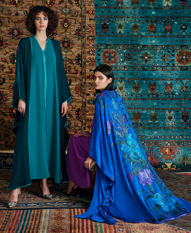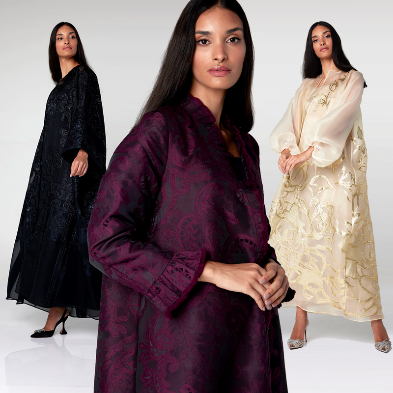 Traditional abaya shilhouette with glittering and moonlight tones, twisted with expressive floral patterns, puffer sleeves,chic ruffles andfabulous cuts.